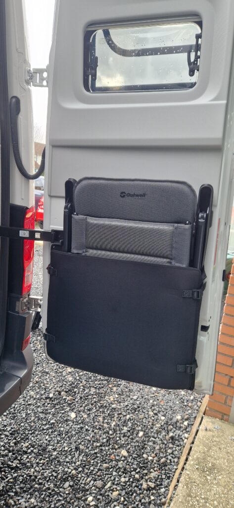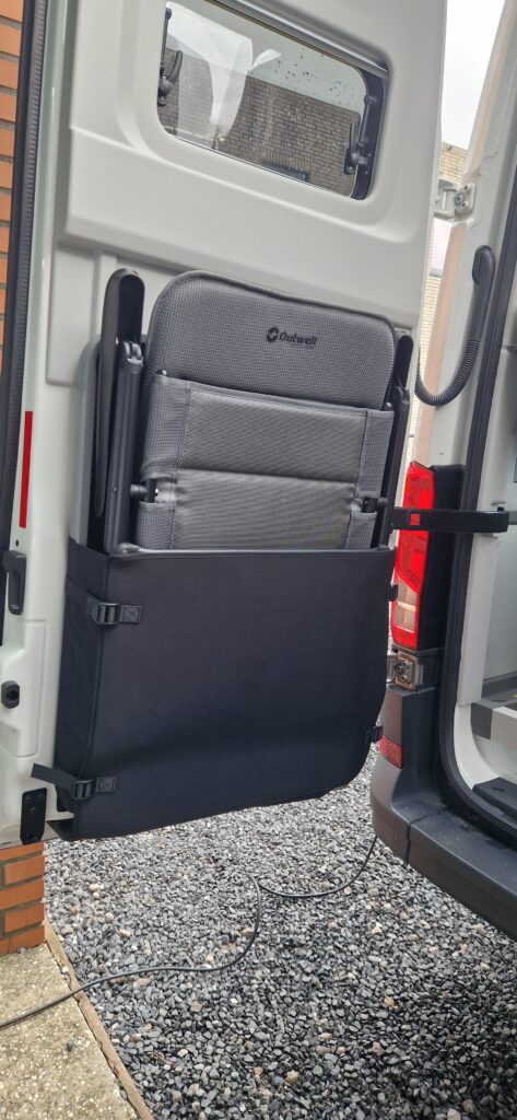 Alternatief voor de set stoelen en tafel met opbergzak. In de zak zit een bevestigingssysteem waar de stoel en tafel op rust. Deze wordt bevestigd met blindklinkmoeren aan de deur voor goede ondersteuning. Stoelen zitten nog eens beter dan de originele en heeft 3 rugleunstanden. Tafel is ook in hoogte verstelbaar.